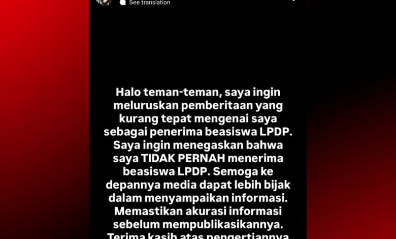 “Halo teman-teman, saya ingin meluruskan pemberitaan yang kurang tepat mengenai saya sebagai penerima beasiswa LPDP. Saya ingin menegaskan bahwa saya tidak pernah menerima beasiswa LPDP,” tulis Isyana Sarasvati di Instagram Stories.