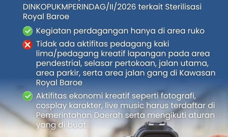 Dalam pemberitahuan tersebut dijelaskan bahwa kegiatan perdagangan di kawasan Royal Baroe hanya diperbolehkan berlangsung di area ruko. Sementara itu, aktivitas pedagang kaki lima (PKL) maupun pedagang kreatif lapangan tidak diperkenankan berjualan di area pedestrian, selasar pertokoan, jalan utama, area parkir, hingga jalan gang di kawasan Royal Baroe.