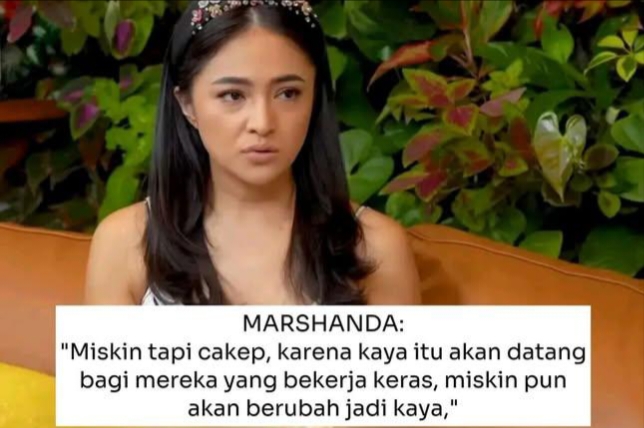 Marshanda berpedapat, memilih cowok miskin asalkan wajahnya ganteng. “Miskin tapi cakep, karena kaya itu akan datang bagi mereka yang bekerja keras, miskin pun akan berubah jadi kaya.”