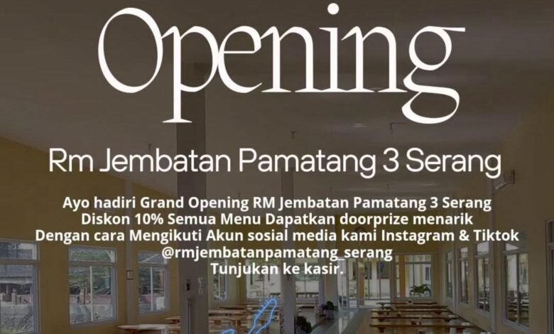 ZETIZENS.ID– Rumah makan  Jembatan Pamatang 3 Serang akan menggelar acara grand opening pada 21 Februari 2026 ini. Peresmian tersebut akan berlangsung mulai pukul 15.00 hingga 22.00 WIB di lokasi barunya yang berada di Jl. Raya Mayabon Cipocok, Kampung Cibebek RT 01/RW 06, Kecamatan Cipocok, Kota Serang, Banten.