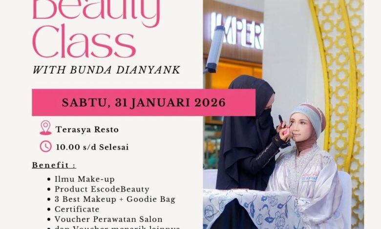 Beauty class ini merupakan kolaborasi antara Bunda Dian Yank (@dianyank88) dengan Escode Beauty Banten (@Escodebeautybanten). Kegiatan tersebut dijadwalkan berlangsung pada Sabtu, 31 Januari 2026, bertempat di Resto Terasya Dalung, mulai pukul 10.00 WIB hingga selesai.