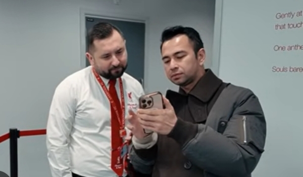 Momen tersebut terjadi saat Raffi dan Rafathar mengikuti stadium tour yang dipandu oleh seorang pemandu wisata (tour guide) bernama Mario, yang merupakan staf Liverpool.